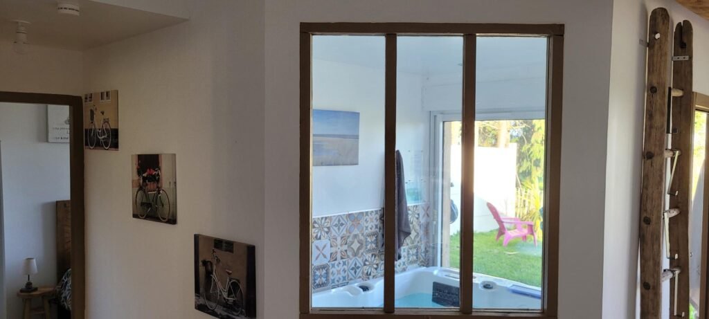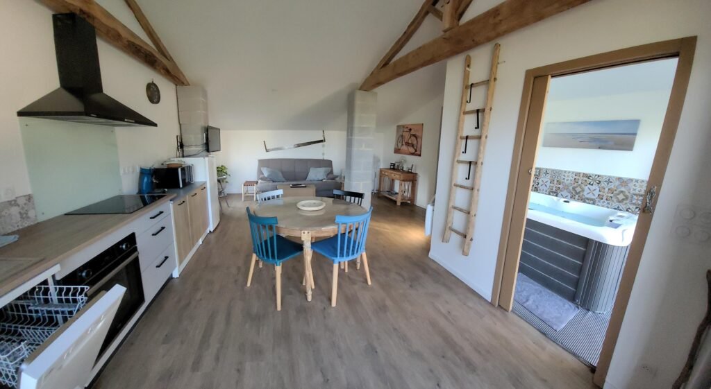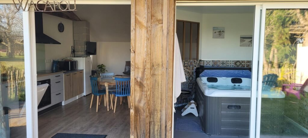 Le Wacapou est un petit gîte très cosy d’une chambre, 1 salle de vie, 1 cuisine équipée (four, lave vaisselle, plaque à induction, cafetière Senseo et cafetière filtre, grille pain, bouilloire), 1 WC, 1 salles de bain et un espace détente avec spa 2 places.